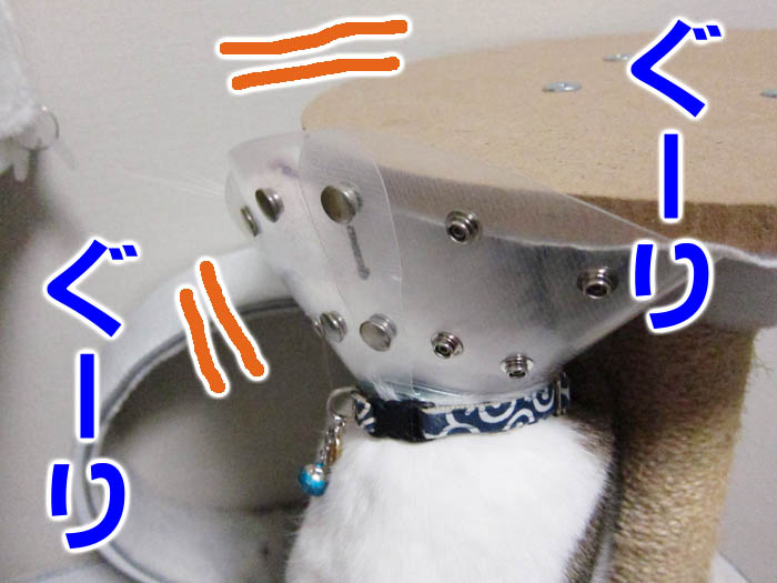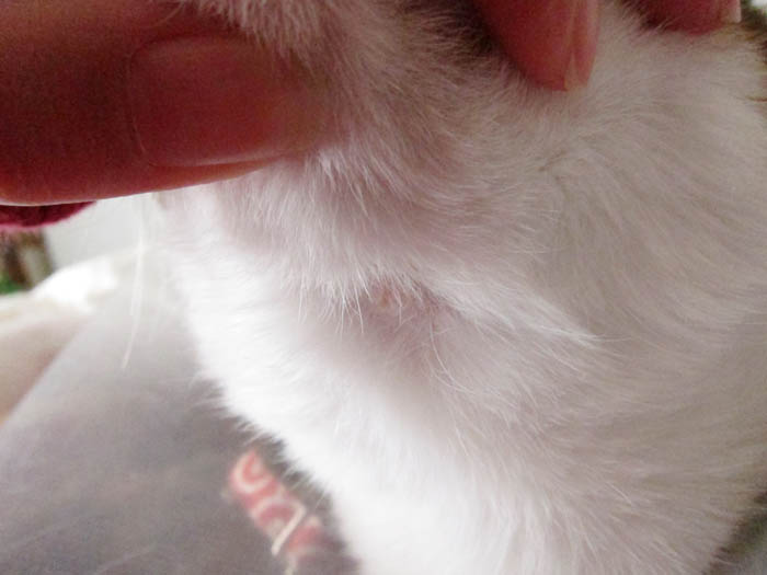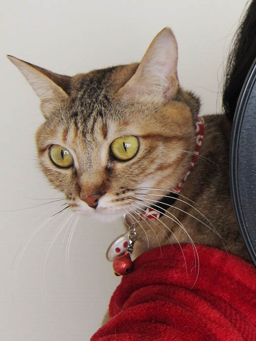 ちょっと変な感じで服の中に収まり、ぴっち♀の猫袋的な何か。耳のない猫は怖いです。