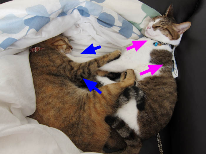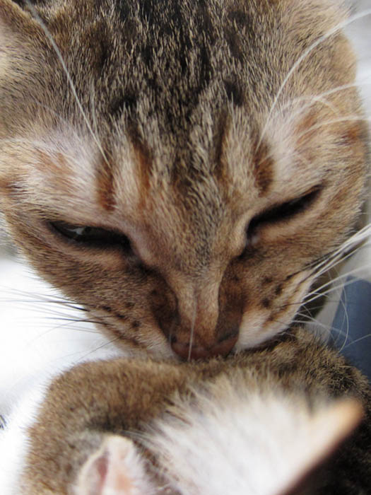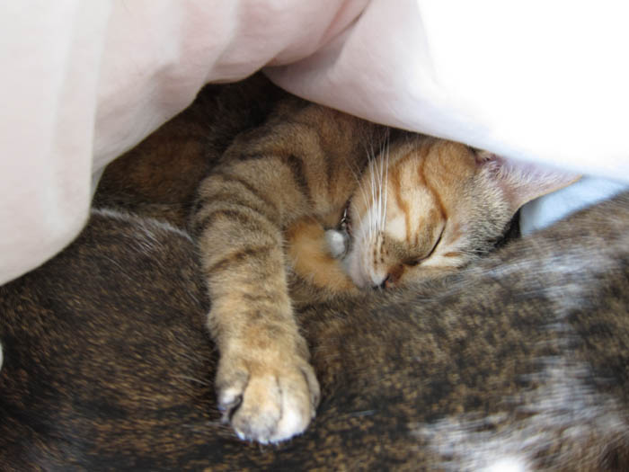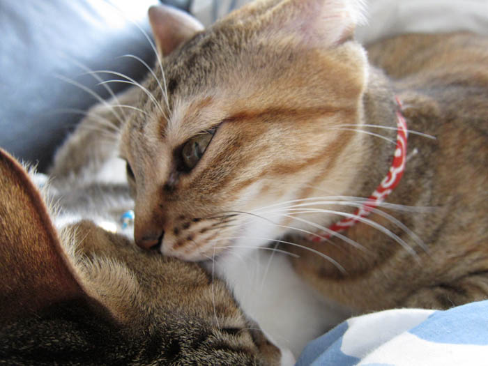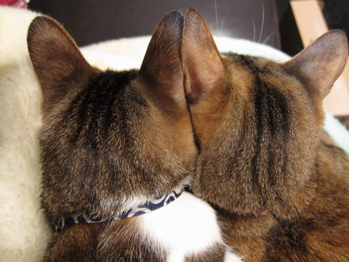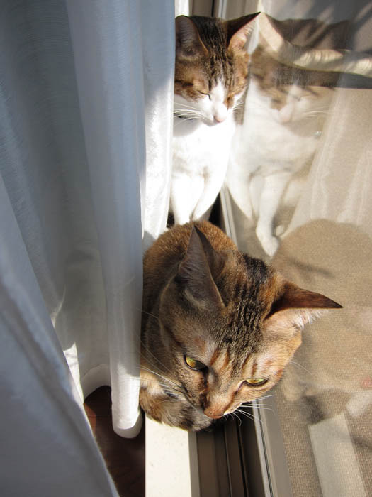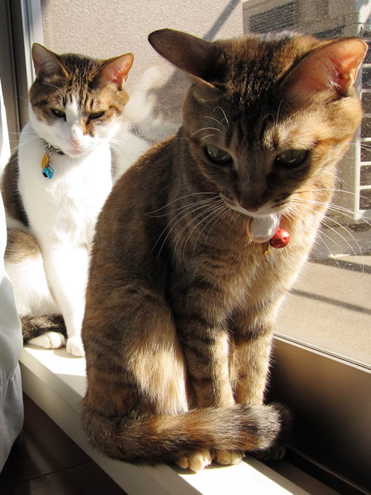 2010年 3/30(火) 591日目のぴっち♀とぽっけ♂ ~網戸掃除に危険な猫~窓際で2連結。シッポもお揃いポーズで巻いています。網戸掃除に猫は……。
