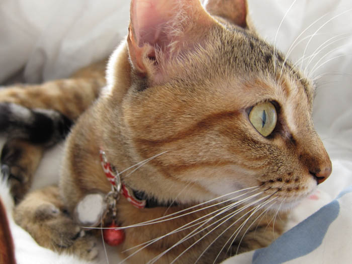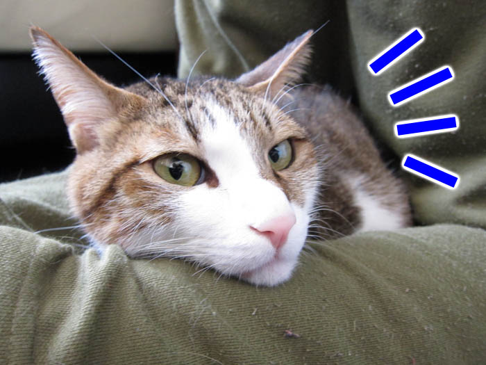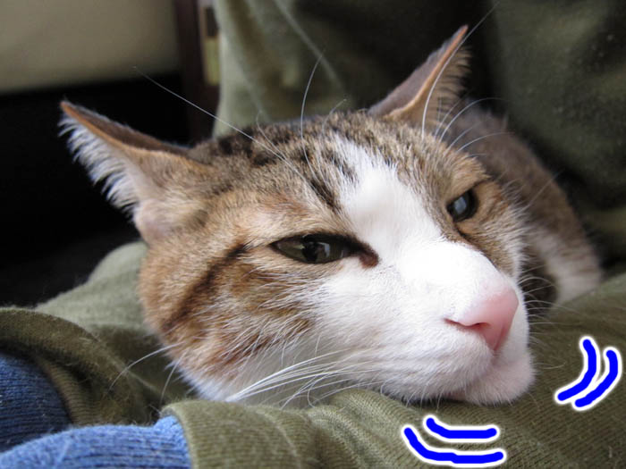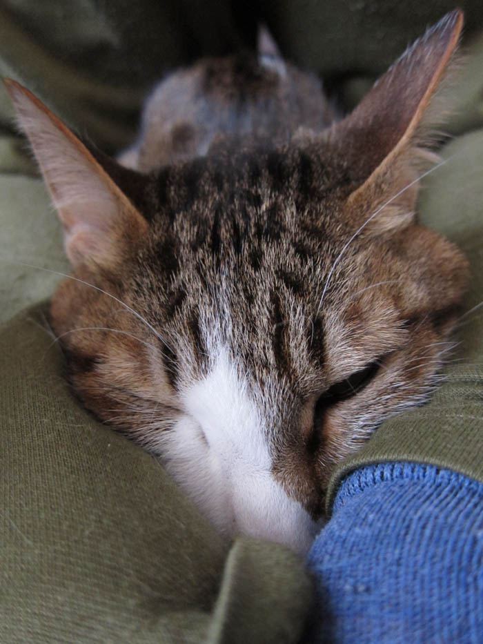 2009年 3/30(月) 226日目のぴっち♀とぽっけ♂ ~変だったりするぴっち♀~ちょっと変な感じで服の中に収まり、ぴっち♀の猫袋的な何か。耳のない猫は怖いです。