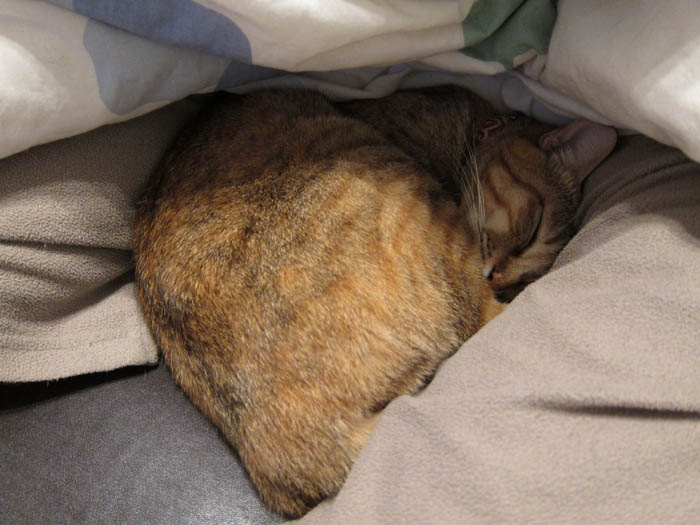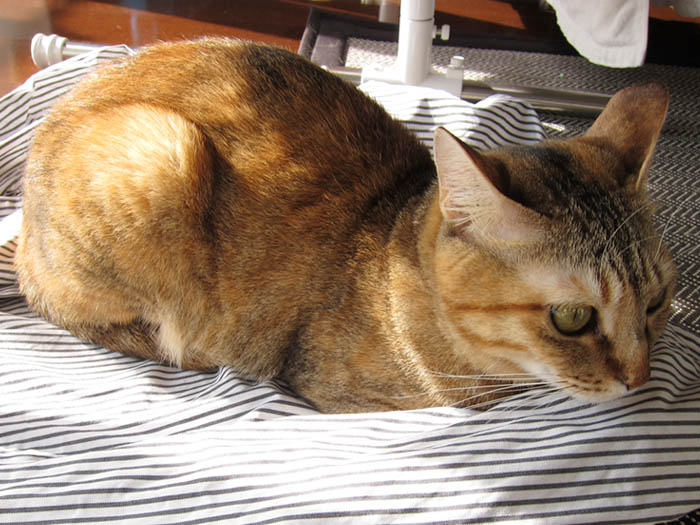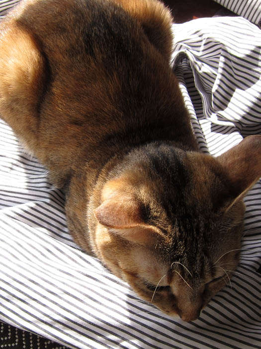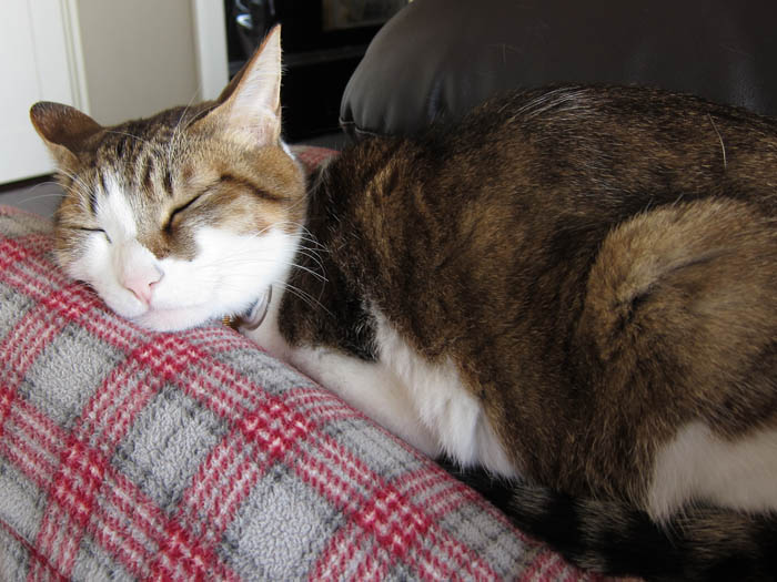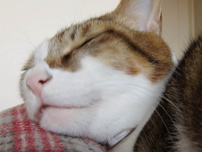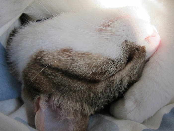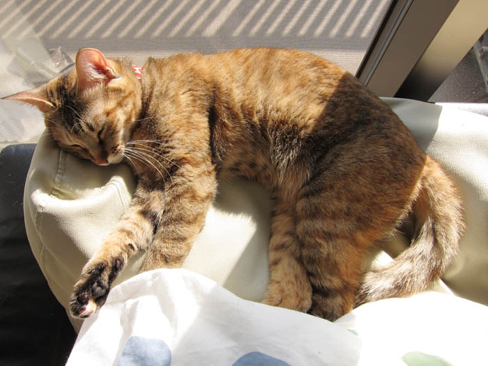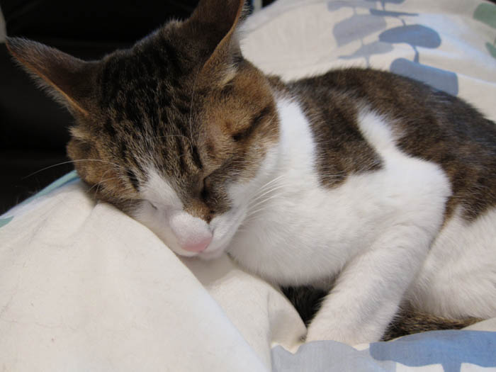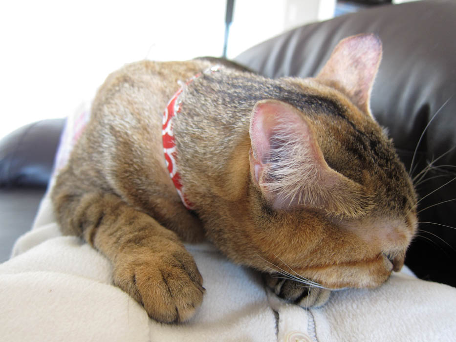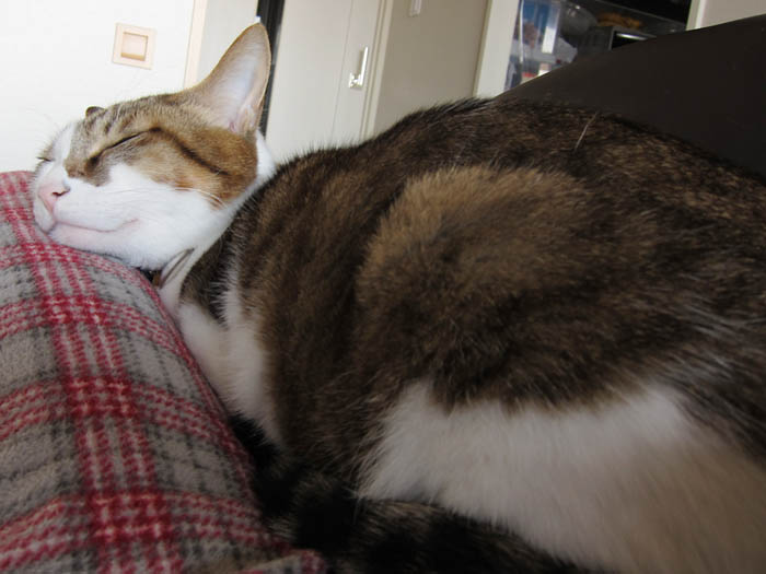 の足の上で顎を乗せて寝ているぽっけ♂。