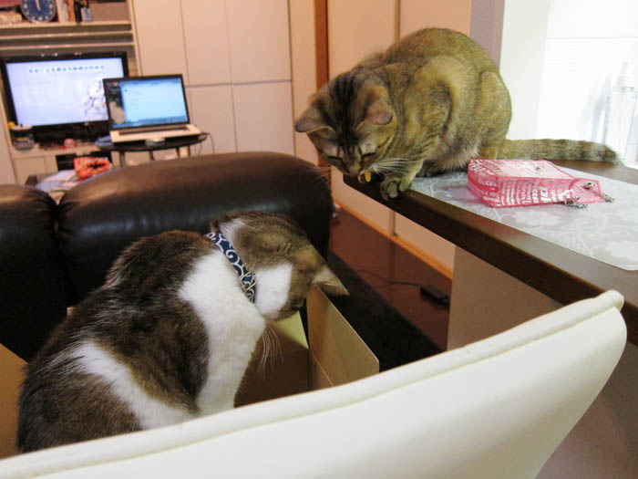 を始めて目にした2匹。もちろん転がしてみたりと、色々お邪魔してくれました。