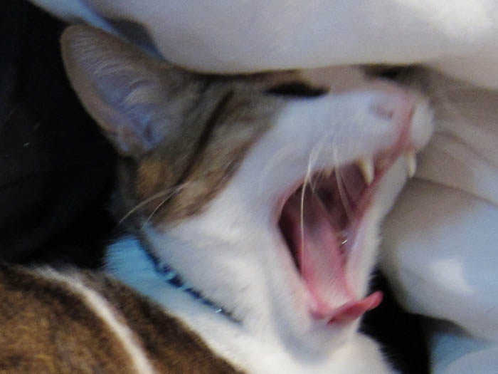 をゲットして一晩。ぴっち♀のキバを前に、布団の安否は如何に