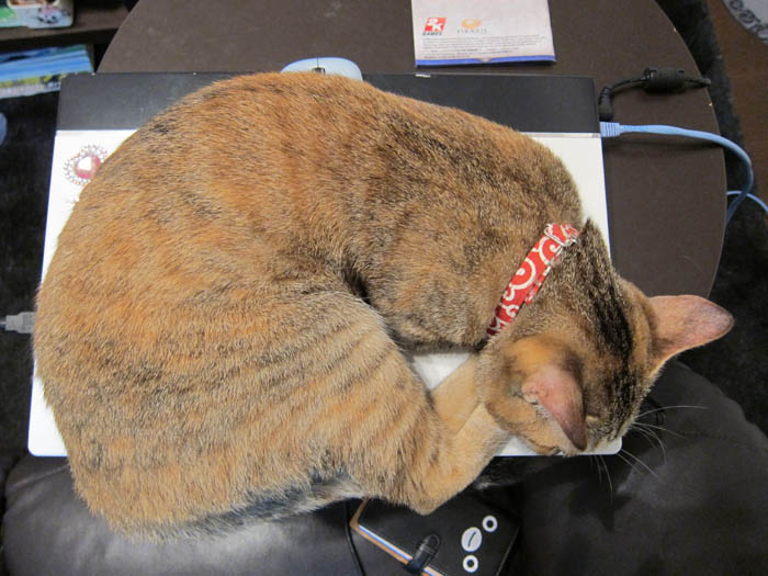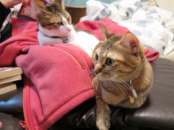 を使っていると、だんだん熱を帯びてくるので、「暖かいもの」と認識しているらしい2匹。