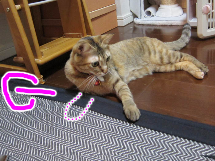 勢い余ってラグの下に左前足