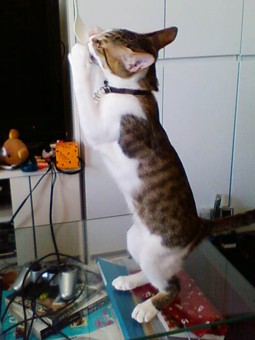 竿の先についた紐で猫釣り。