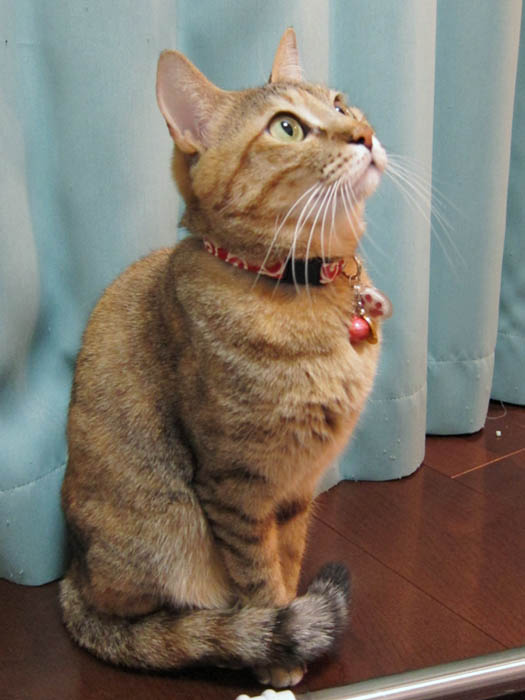 を揃え、しっぽ巻きしているぴっち♀。ぴっち♀ 「あたちなのニャ