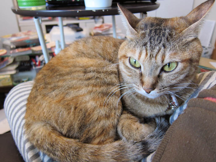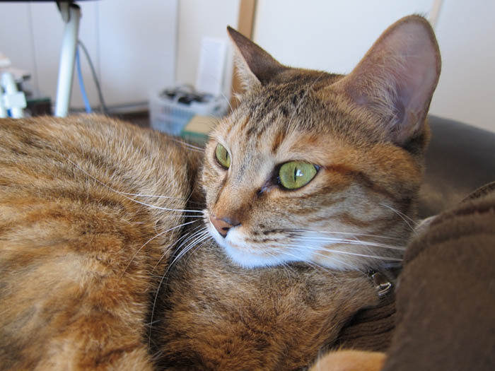 の膝の上に陣取るぴっち♀。何やら決意が伝わってきますが、