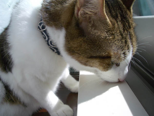 起き上がって窓枠をフンフンし始めました。