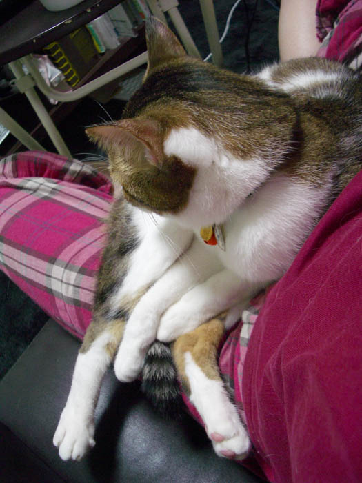 私の膝の上に陣取り中のぽっけ♂。