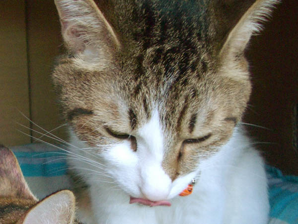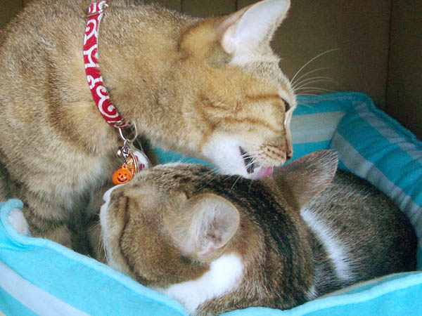 2008年 9/30(火) 45日目のぴっち♀ぽっけ♂ ~猫カンガルー再び~カンガルー袋のぴっち♀とついでにぽっけ♂も。ぴっち♀がぽっけ♂の頬をガブリ