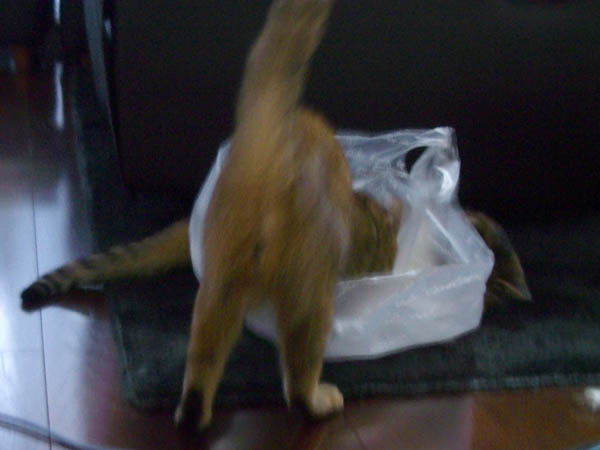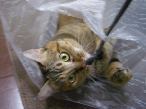 結んだスーパーのビニール袋を獲物代わりにして、