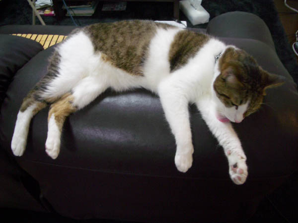 ソファーで毛並みのお手入れをするぽっけ♂。