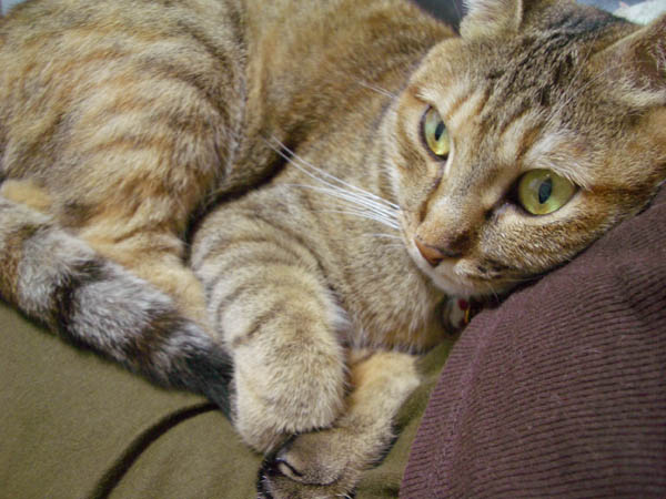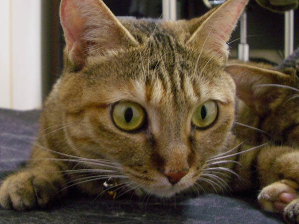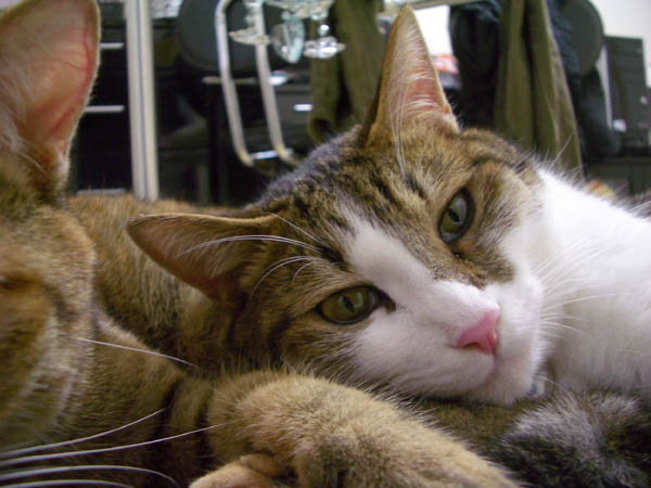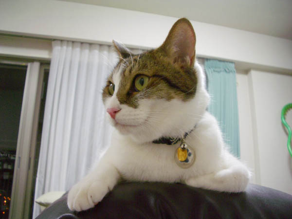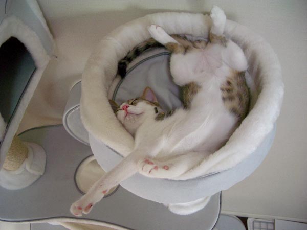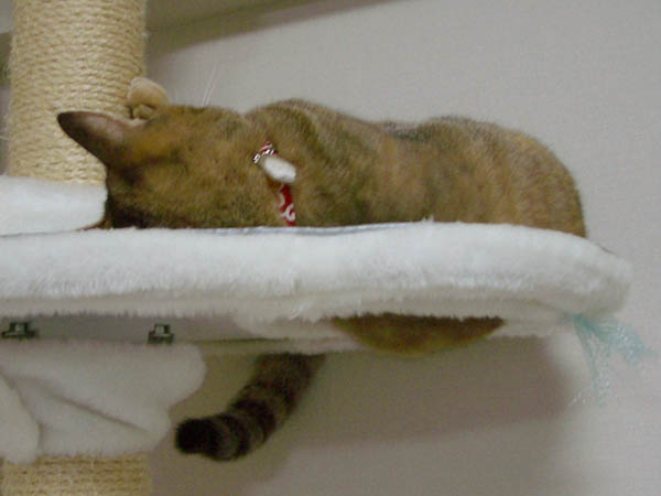 (写真右)はちょっと焦げたクリームパン。寝転んだまま、柱で軽~くツメとぎをしてみたり。