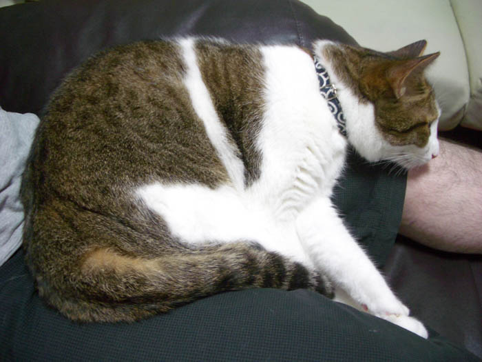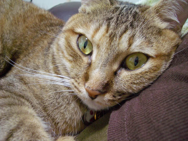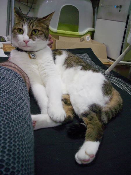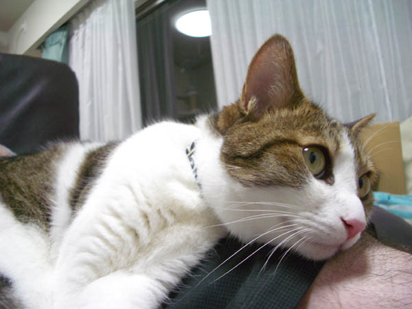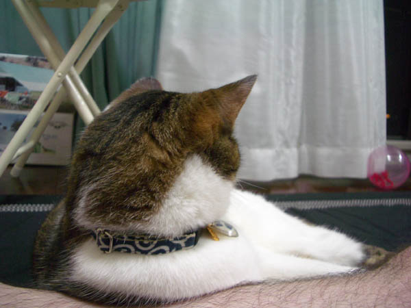 の足元へ移動。ぽっけ♂ 「ココ、ボクのマクラにするです~。」