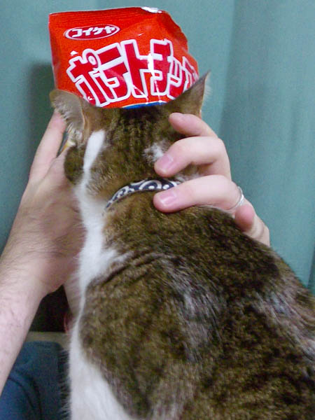 が頭上にポテチを避難させるものの、長~く伸びて、容赦なくポテチを追うぽっけ♂。