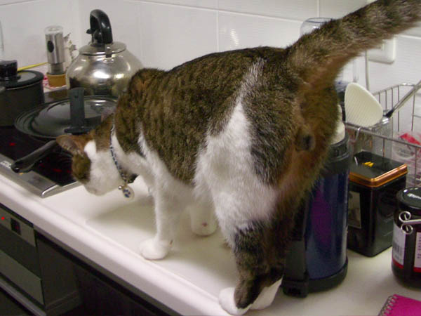 IHコンロに張り付いて様子を伺うぽっけ♂。