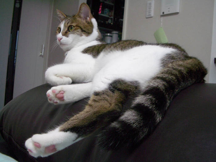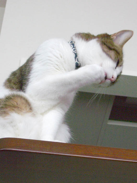 ぴんと伸びたしっぽを壁のタイルに押し付けたままで。