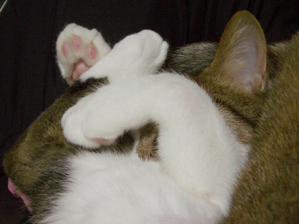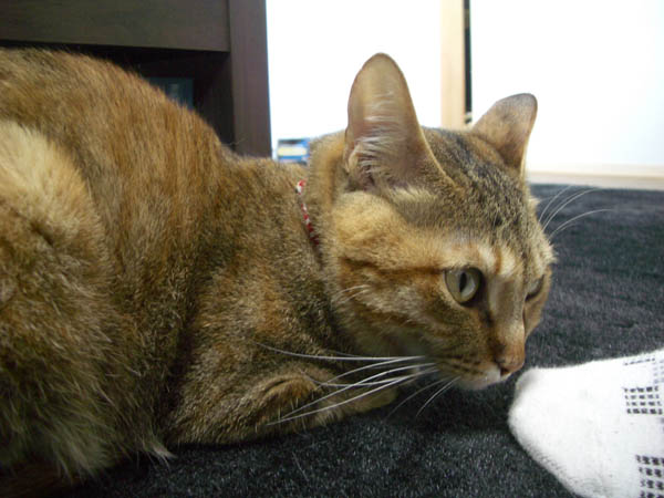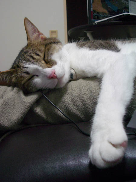 の足へと枕を変更しました。やる気なさげなダラリとした前足
