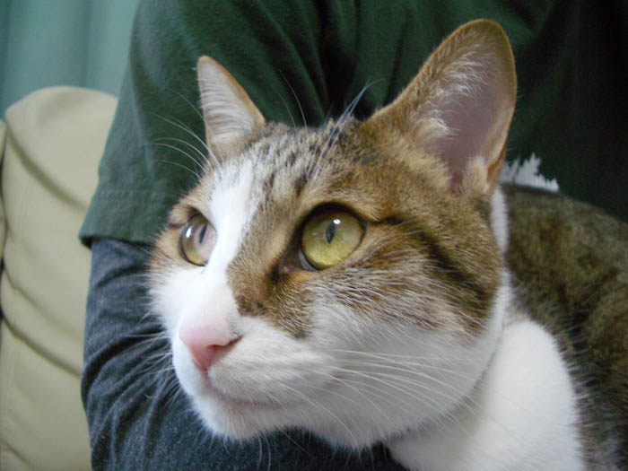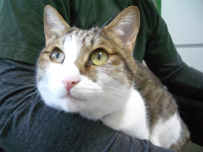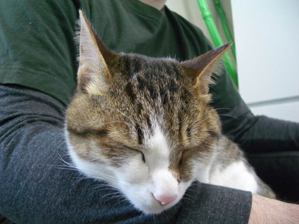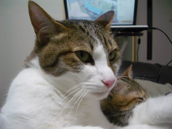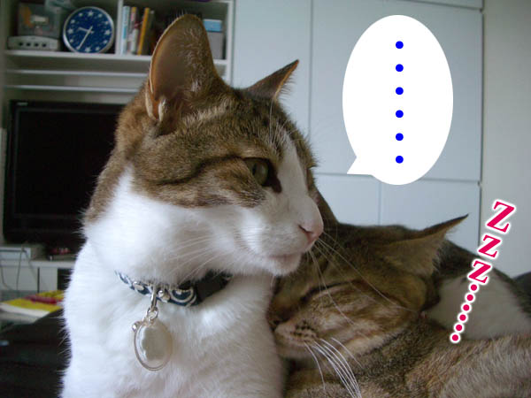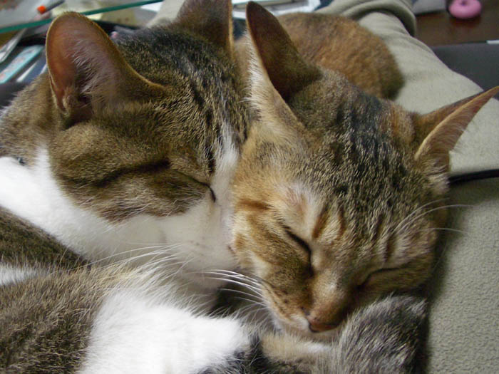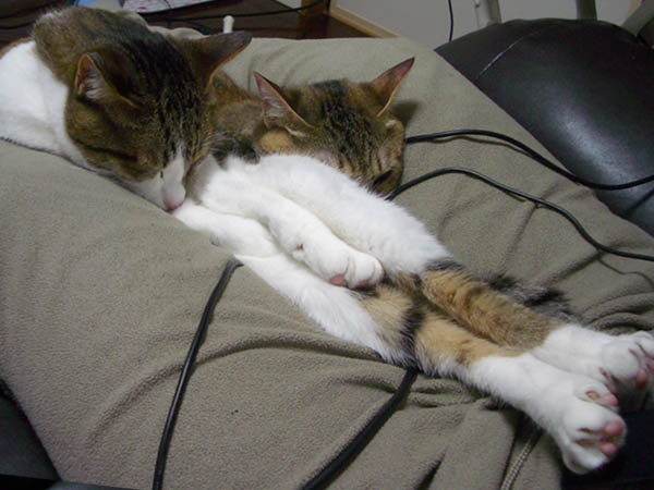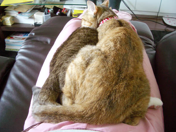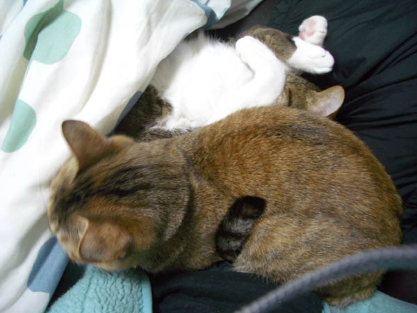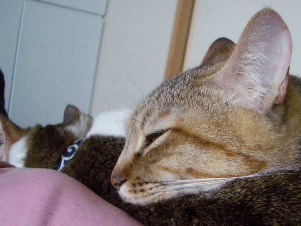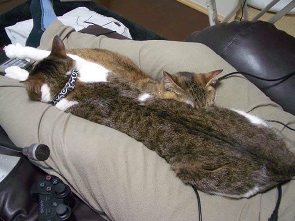の膝の上です。2匹一緒に、普通に寝ていますが……。