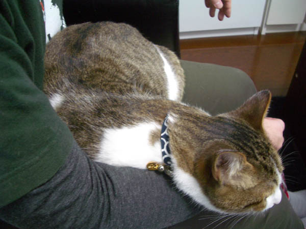 の胡坐の上にて。人間がやったら肩がこりそうな首の曲がり具合です。