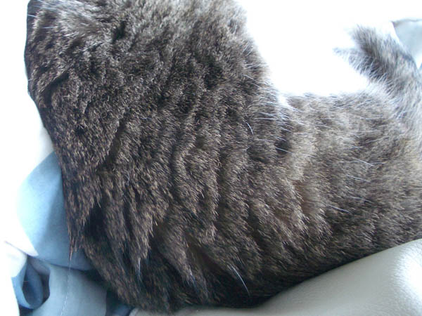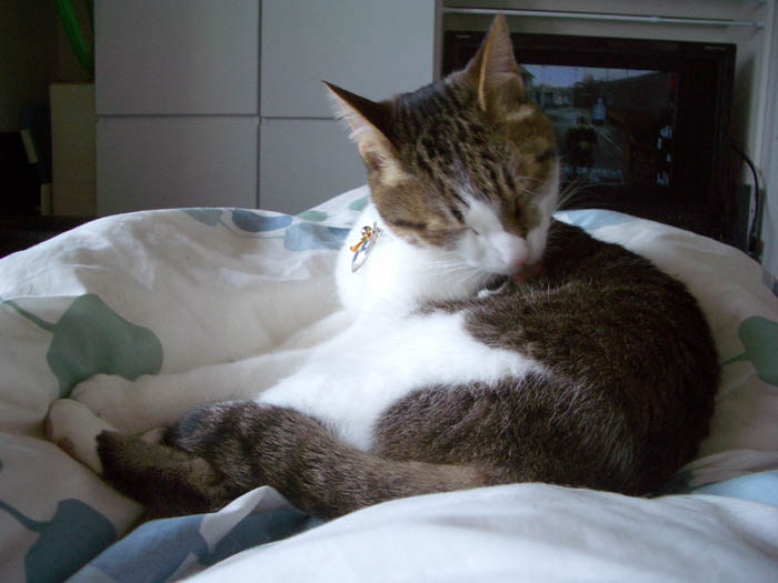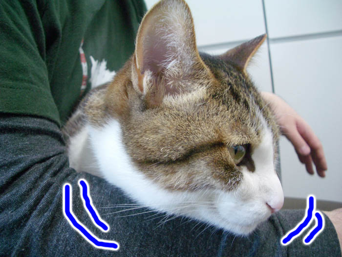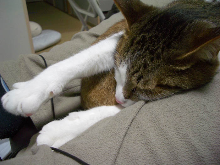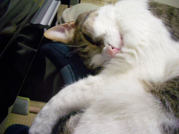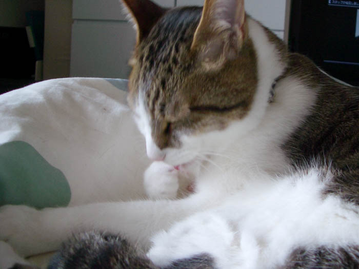 の膝(羽毛布団つき)の上で同じくお手入れをしています。