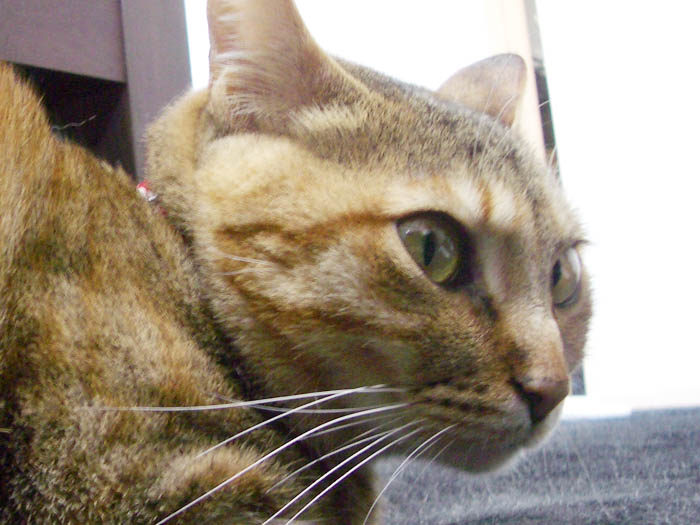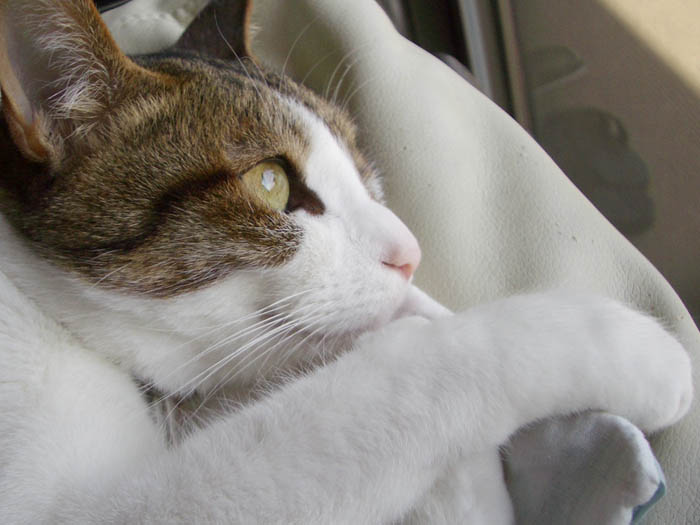 をちょいっと伸ばして、外を見やるぽっけ♂。