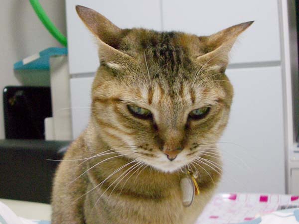 の前で非常に不満顔のぽっけ♂。ゴハンを「早く早く」と、要求していますが……。