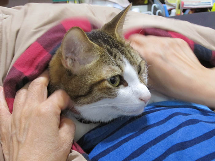 狭い膝の上に落ち着いてしまいました。