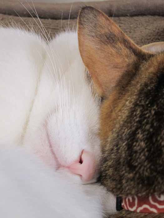2011年 3/30(水) 956日目のぴっち♀とぽっけ♂ ~ゴハンを猫視眈々~暖かい時間は窓際、夜は膝の上で暖を取る2匹。寝起きは気合が足りず……。