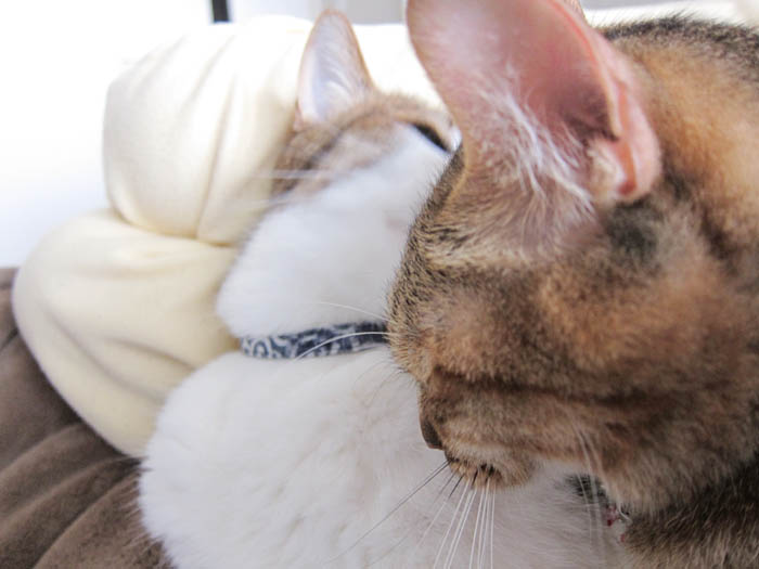 2012年 6/11(月) 1395日目のぴっち♀とぽっけ♂ ~前足で耳をポフリ~くっついてお昼寝する2匹。ぴっち♀がぽっけ♂の耳を……。テーブルの端にスリスリ。