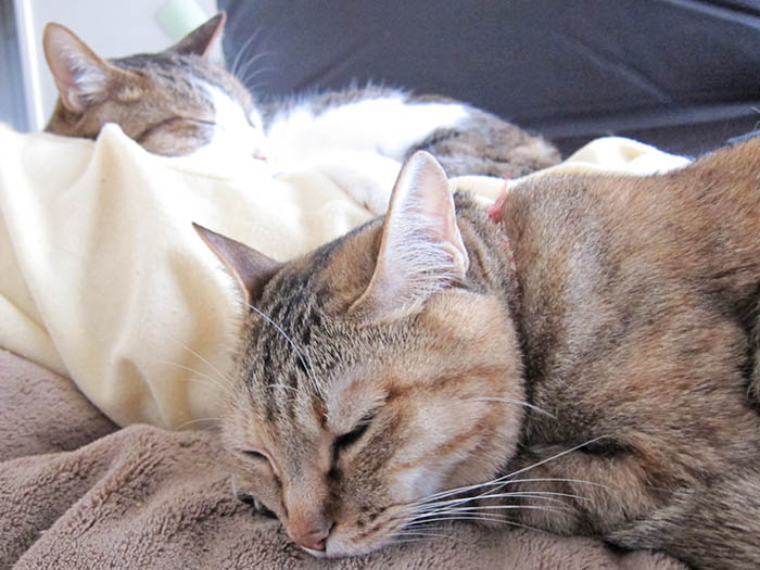 2009年 6/9(火) 297日目のぴっち♀とぽっけ♂ ~重い掛け布団~ぽっけ♂と一緒に、猫ベッドにいるぴっち♀はとっても不満顔。その訳は……。