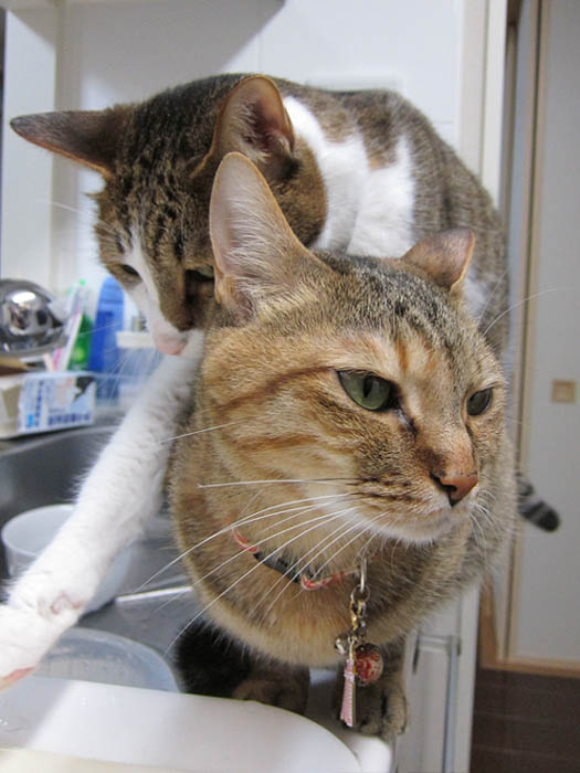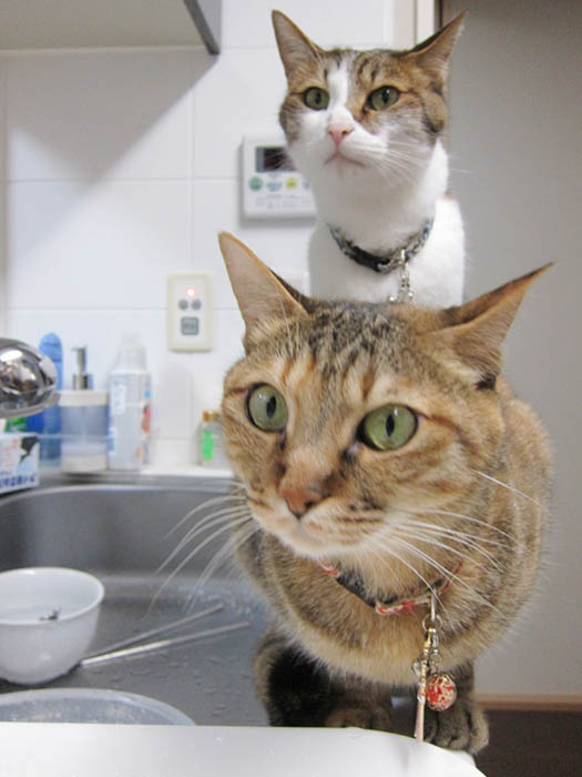 シンクの手前に2匹が並び、