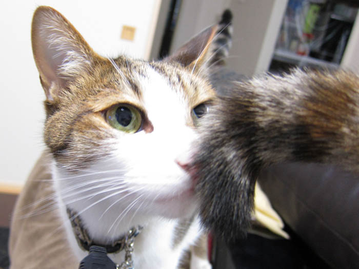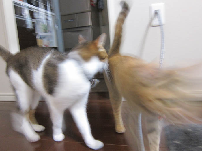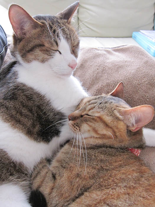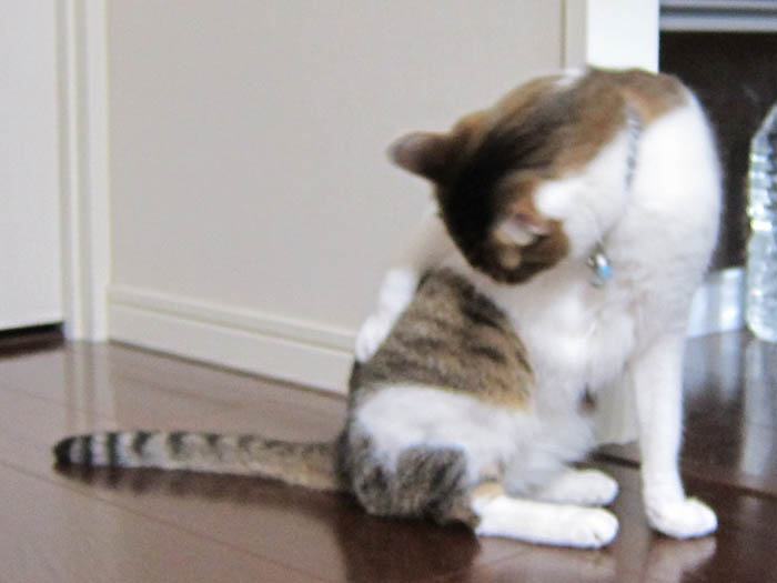 新規写真追加。ご褒美のカリカリをもらって満足した2匹の毛づくろい。前足あむあむぴっち♀が可愛いです。