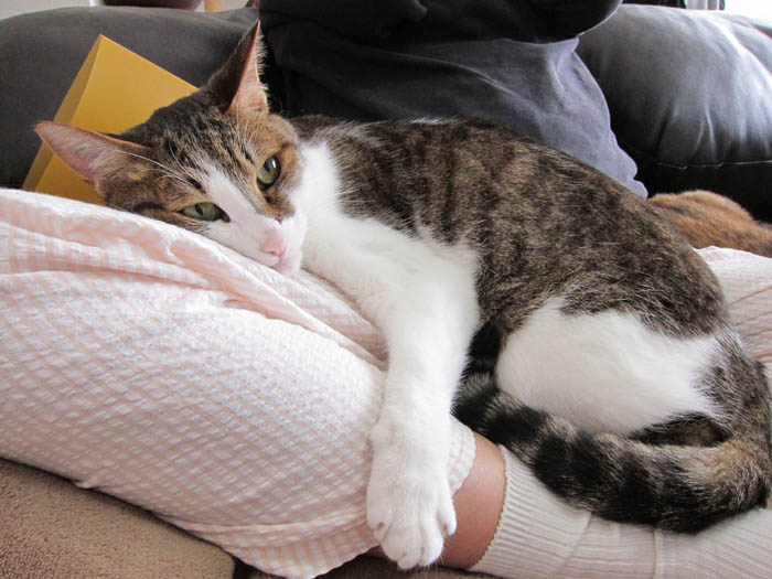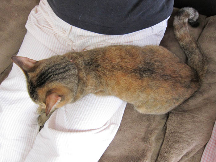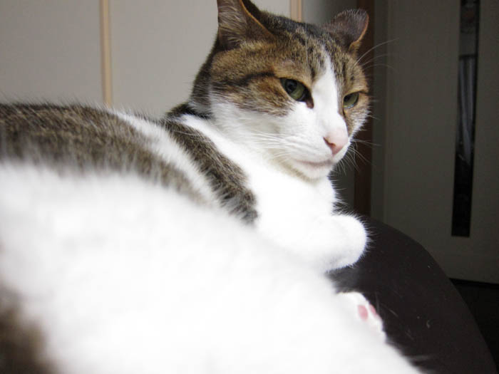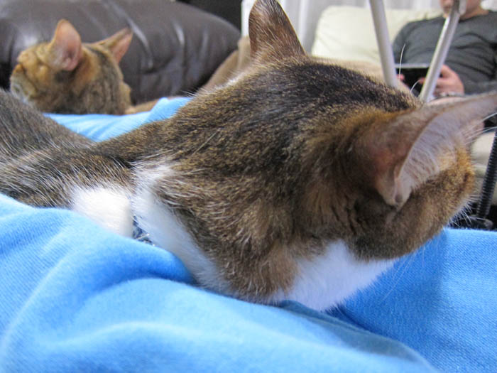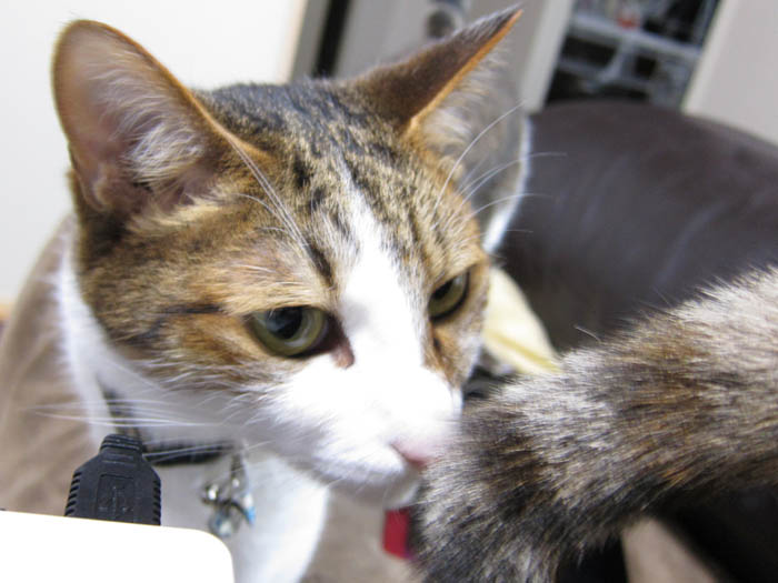 2010年 5/31(月) 653日目のぴっち♀とぽっけ♂ ~食後の膝乗りお手入れ~新規写真追加。ご褒美のカリカリをもらって満足した2匹の毛づくろい。前足あむあむぴっち♀が可愛いです。