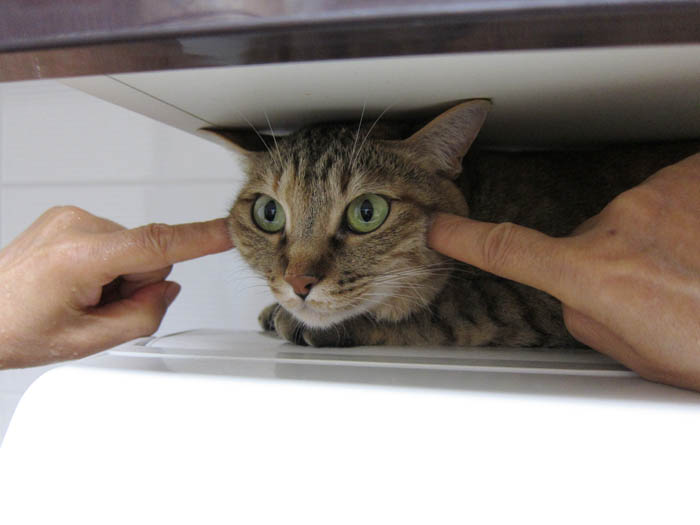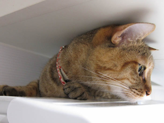 炊飯器の中(もちろん空)を舐めようと、蓋をあけるべく頑張るぽっけ♂。お鼻もフンフンヒコヒコ。