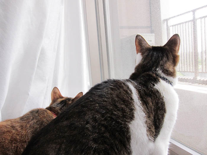 2011年 5/18(水) 1005日目のぴっち♀とぽっけ♂ ~プロレスのような~ぽっけ♂の大好きな【髪ゴムちゃむちゃむ】。こだわりがあるようです。ドアのガラス窓を2匹が……。