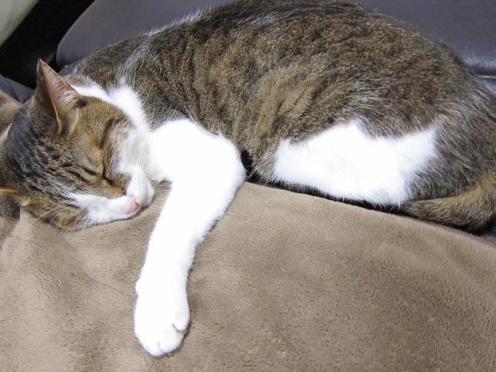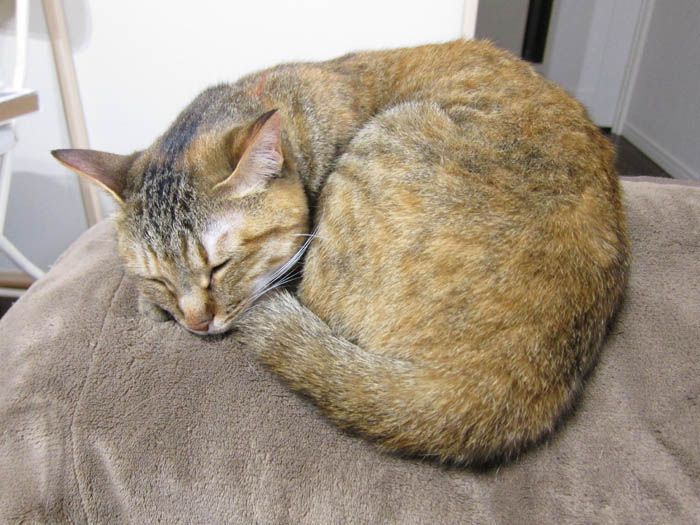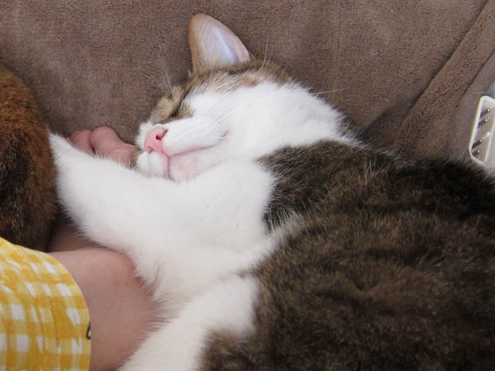 の膝の上で真ん丸に。こちらは多少動いても全く平気です。