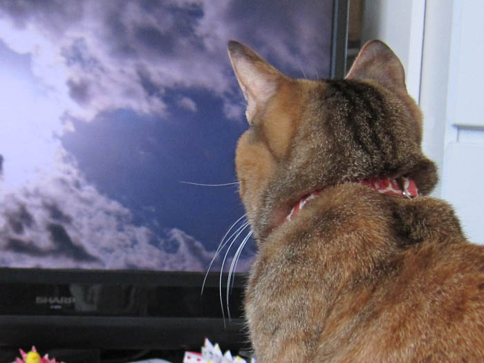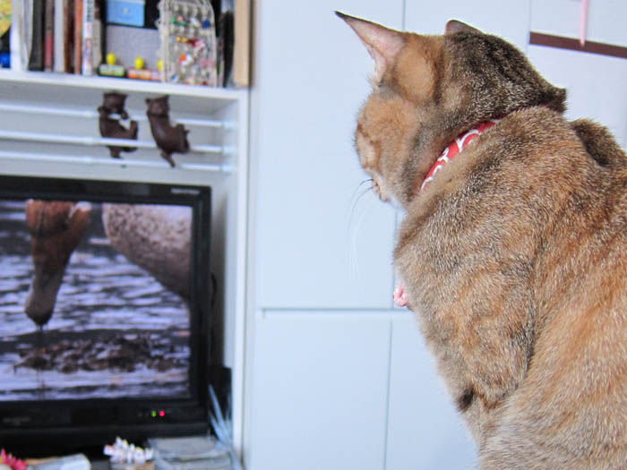 テレビをじーっと見ています。