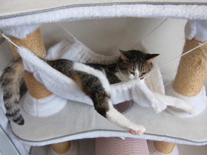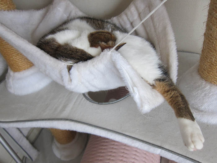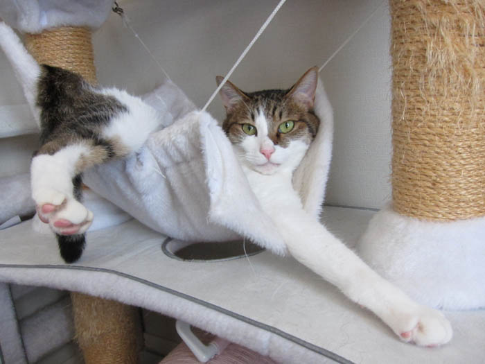 2010年 8/24(火) 738日目のぴっち♀とぽっけ♂ ~猫が猫踏んじゃった~新規写真追加。ぴっち♀が眠るハンモックに突入したぽっけ♂がウッカリぴっち♀を踏んでしまい……。