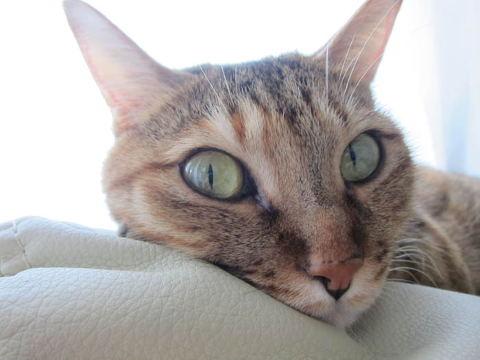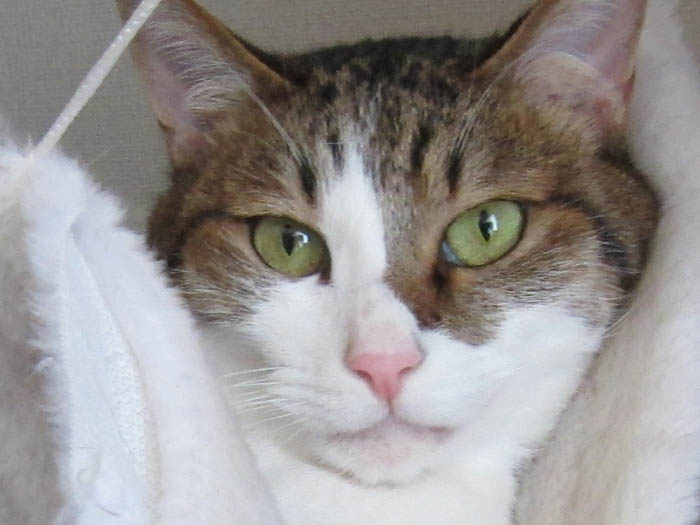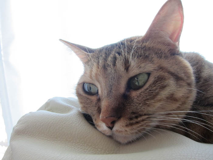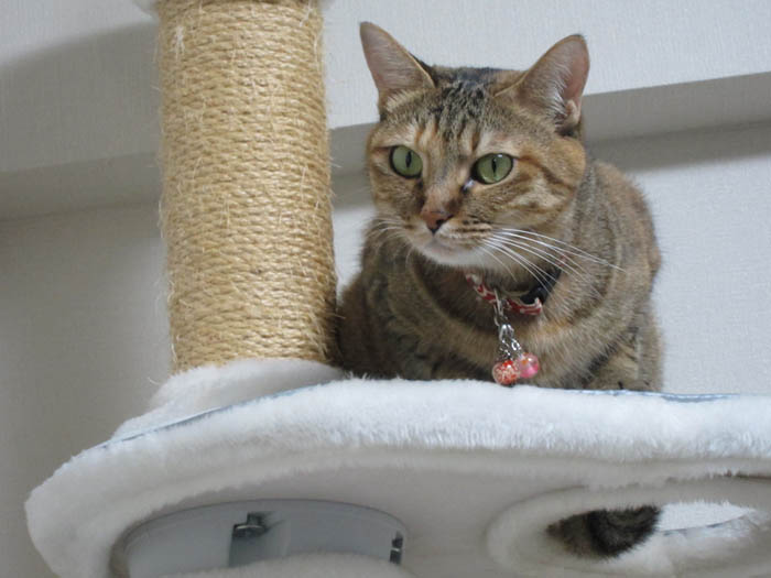 を狙ってのゴハンコール。ぽっけ♂は食いしん坊の割に、真剣味に欠けるような……。猫タワーの【元・丸】の上に乗せられた