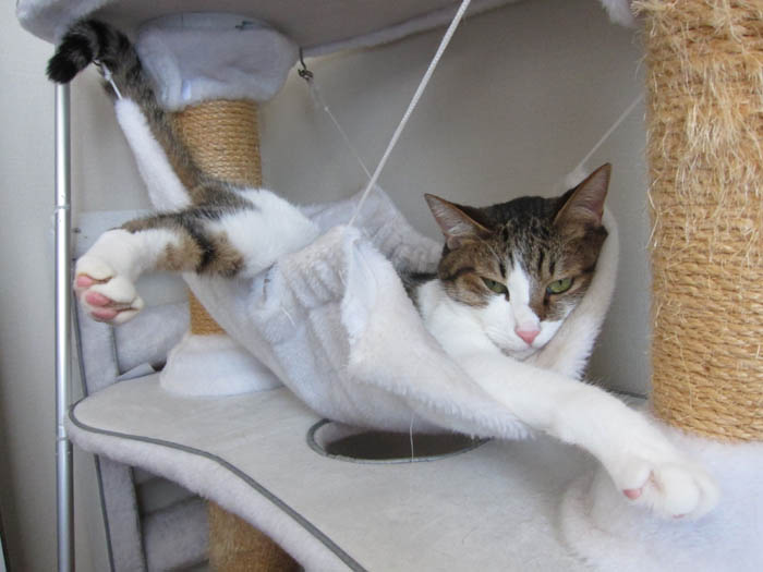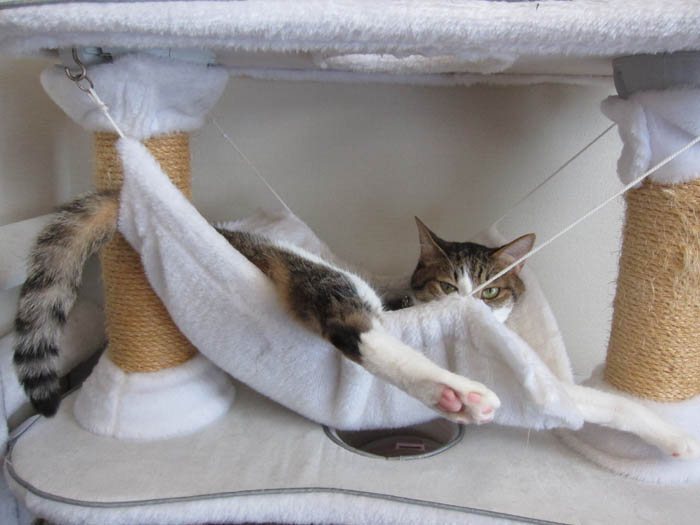 は横からはみ出しつつ前方へ、しっぽはハンモックの縁に沿って上へ。