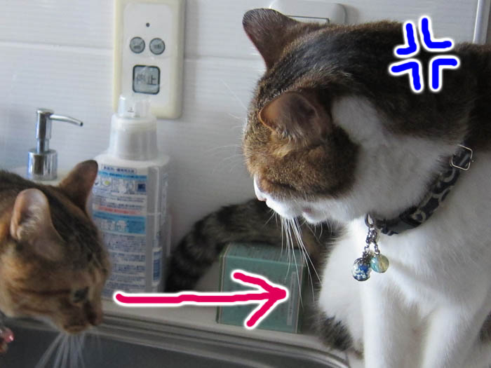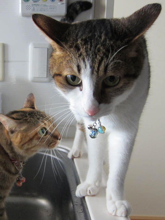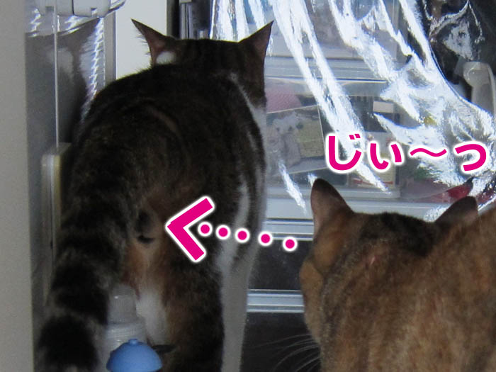 2011年 8/13(土) 1092日目のぴっち♀とぽっけ♂ ~バターに釣られて~朝ごはん食材を狙ってキッチンにやって来た2匹。バターの匂いが特に好きなようで……。