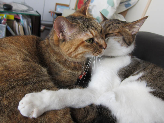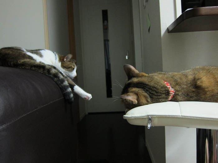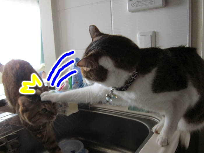 2010年 8/13(金) 727日目のぴっち♀とぽっけ♂ ~イタズラの瞬間~ 半ばやつあたり的にちょっかいをかけるぴっち♀。ぽっけ♂は猫パンチ