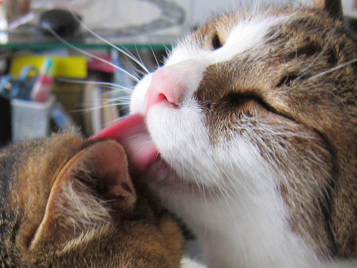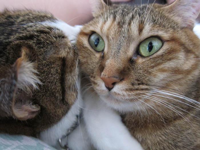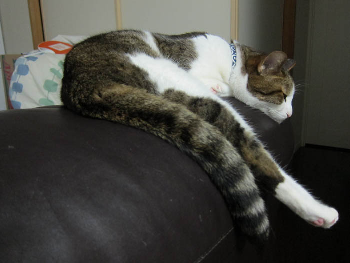 2009年 8/10(月) 359日目のぴっち♀とぽっけ♂ ~猫以外の何か~新規写真追加。アクロバティックな毛づくろいの姿勢は、角度によって「ぽっけ♂ではない何か」に思えました。