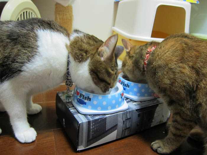 2010年 7/29(木) 712日目のぴっち♀とぽっけ♂ ~体重計~ 体重計に乗ってゴハンを食べるぽっけ♂。猫タワーでコロコロなぴっち♀。