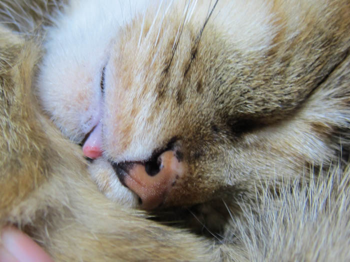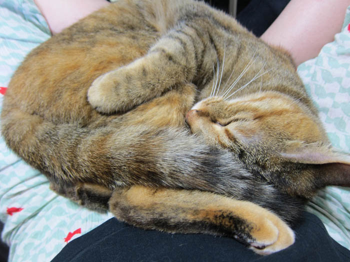 の膝の上でいつものように丸くなっています。口元にご注目下さい。