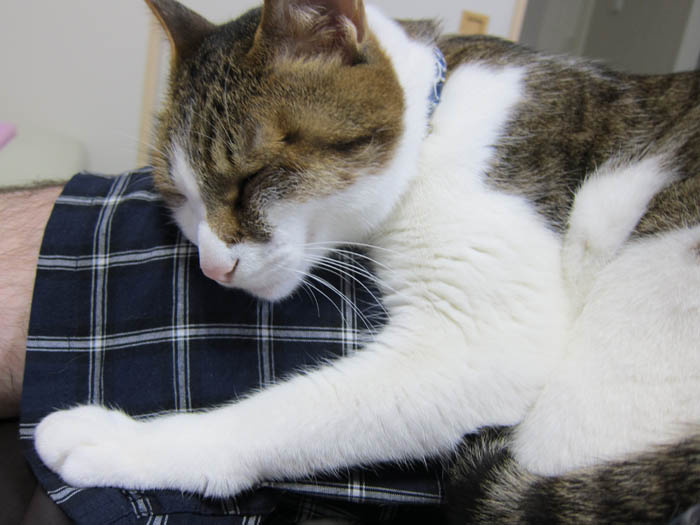 の足の間にはまり、腿を枕にしつつお昼寝中のぽっけ♂。