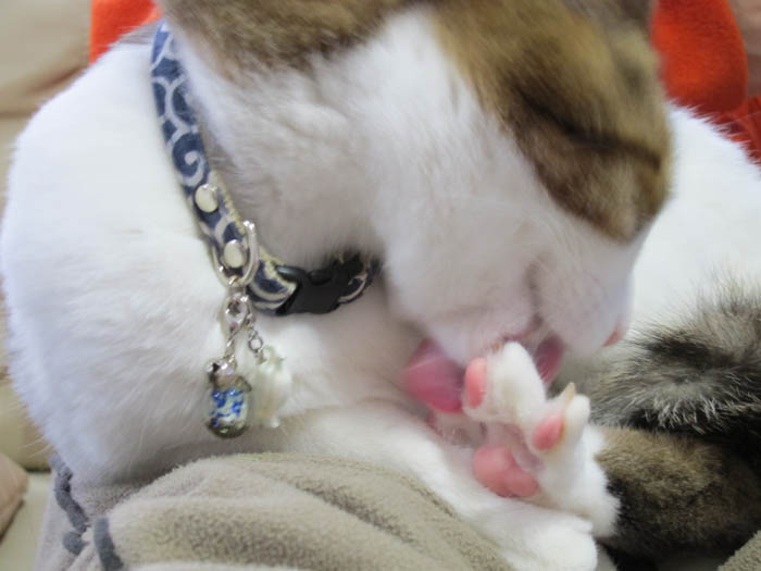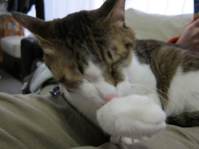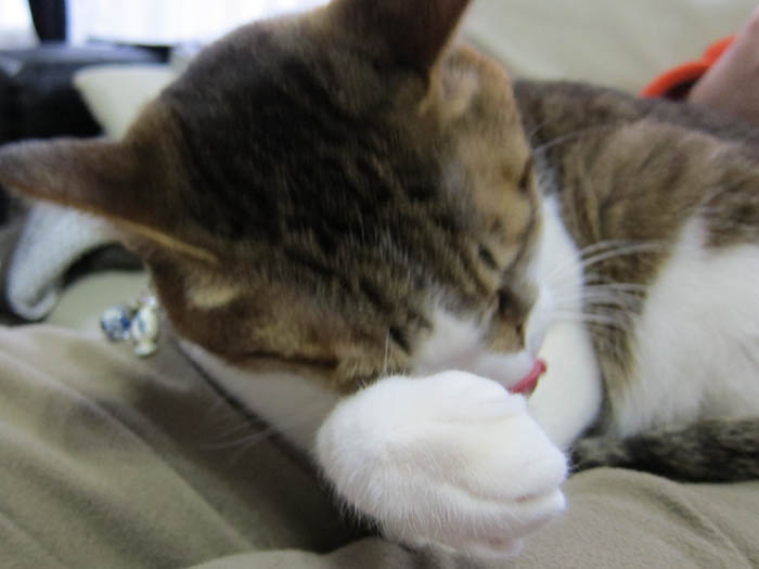 2010年 4/1(木) 593日目のぴっち♀とぽっけ♂ ~膝に2匹~いつもよりリッチだった夜ゴハンに大満足の2匹。食後の毛づくろいした前足