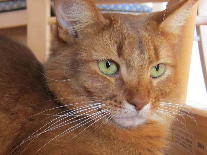 キッチンのカウンター椅子の上で箱座りしつつ、