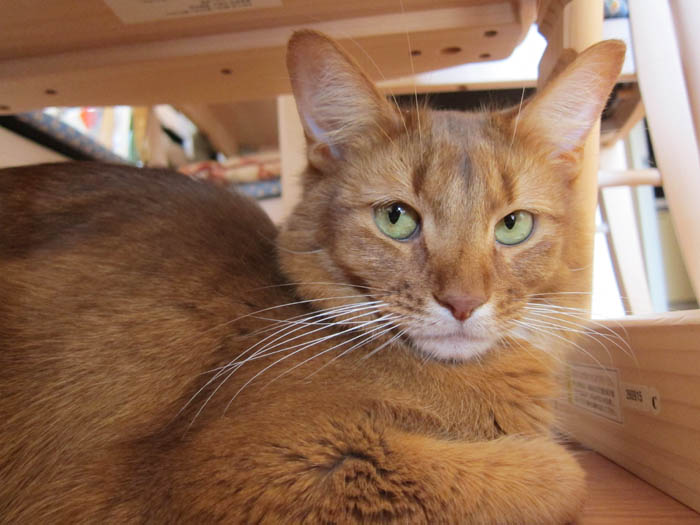 椅子の下や猫ベッドに隠れてしまうのですが、